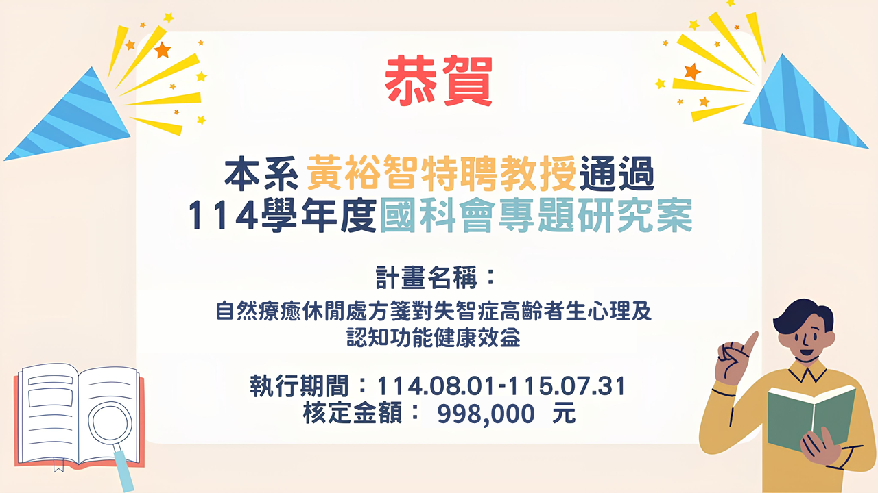 恭賀黃裕智特聘教授榮獲國科會專題研究計畫國科會專題研究計畫:自然療癒休閒處方箋對失智症高齡者生心理及認知功能健康效益, 經費總額998,000元。