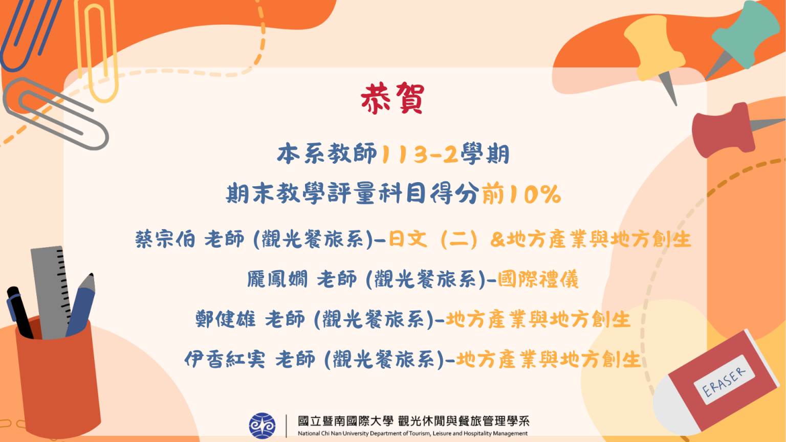 恭喜以下本系教師於 113 學年度第 2 學期期末教學評量中,其教授科目獲得學生高度肯定,評量得分進入全校前 10%