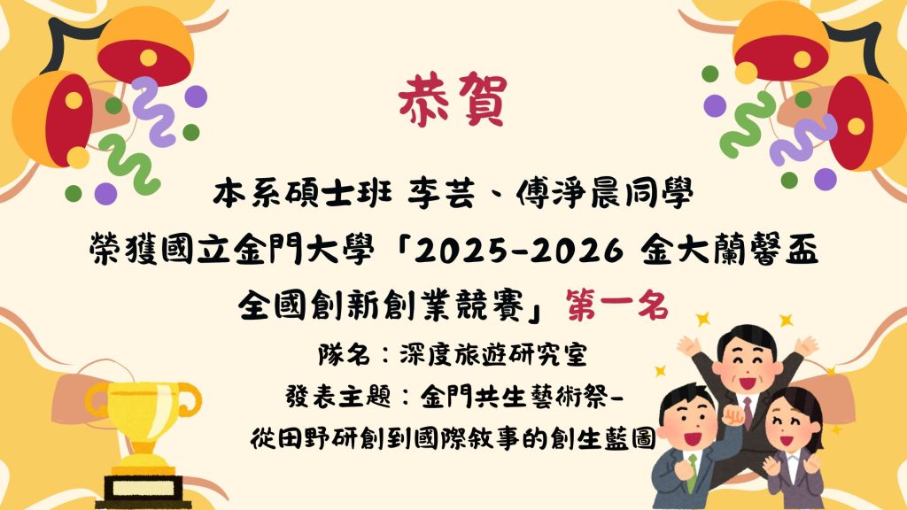 恭賀!!本系碩士班 李芸、傅淨晨同學 榮獲國立金門大學「2025-2026 金大蘭馨盃 全國創新創業競賽」第一名