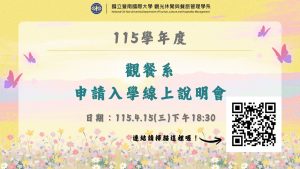 觀光休閒與餐旅管理學系 - 國立暨南國際大學 > 最新消息-所有消息 最新消息 114申請入學考生專區 所有消息 最新消息 招生資訊 榮譽表現 所有消息 觀餐系徵聘專任教師人員公告稿 2026 年 4 月 20 日 Read More » 恭賀!!本系碩士班 李芸、傅淨晨同學 榮獲國立金門大學「2025-2026 金大蘭馨盃 全國創新創業競賽」第一名 2026 年 4 月 16 日 Read More » 115學年度觀餐系申請入學線上說明會 2026 年 4 月 11 日 Read More » 國立暨南國際大學觀光休閒與餐旅管理學系徵求推薦系主任候選人公告 2026 年 4 月 7 日 Read More » 115學年度觀餐系轉系口試時間表與注意事項 2026 年 3 月 31 日 Read More » 115學年度「碩士班考試入學」口試考生注意事項及口試順序 2026 年 2 月 26 日 Read More » 徵聘競爭型員額教師 2026 年 2 月 11 日 Read More » 觀餐系徵聘專任教師人員公告稿 2026 年 2 月 11 日 Read More » 恭賀! 龐鳳嫺副教授獲南投縣政府「2026南投燈會遊客人次統計 及滿意度調查勞務採購案」計畫金額485,000元 2026 年 2 月 11 日 Read More » 「櫻花盛宴:暨大春之饗」 綠色餐桌展現產學合作與生態保育新能量 2026 年 2 月 10 日 Read More » 恭賀!吳淑玲老師榮獲本校114學年度教學優良獎 2026 年 1 月 14 日 Read More » 恭賀!蔡宗伯副教授通過本校114年度教育部延攬及留住大專校院特殊優秀人才彈性薪資獎勵 2026 年 1 月 13 日 Read More » 恭賀!戴有德特聘教授榮獲國立暨南國際大學114學年度國科會特殊優秀人才獎勵 2026 年 1 月 13 日 Read More » 恭賀!黃裕智特聘教授兼系主任榮獲114學年度國立暨南國際大學國科會特殊優秀人才獎勵 2026 年 1 月 13 日 Read More » 115學年度「碩士班考試入學」歡迎報名! 2026 年 1 月 13 日 Read More » 114學年度春季班國際專修部口試時間表 2025 年 12 月 29 日 Read More » 恭喜本系陳冠瑋、國企系許茹詒、楊承逸、經濟系陳乙卉同學參加「2025山城數位黑客松競賽」 榮獲【大專組】第三名 指導老師:丁冰和 老師 2025 年 12 月 23 日 Read More » 恭喜本系學生 陳品宜、陳冠瑋、林芷昀、梁楚昇 參加「第六屆全國休閒健康盃旅遊行程設計創意競賽」 榮獲【大專組】第二名 指導老師:江侑姿 老師 2025 年 12 月 23 日 Read More » « 上一頁 Page1 Page2 Page3 Page4 Page5 下一頁 »